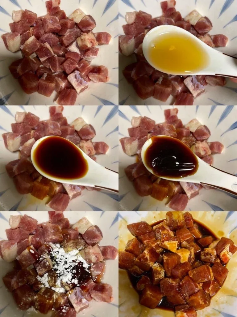 Cut beef into small cubes. Add 1 tbsp cooking wine, 2 tbsp light soy sauce, 1 tbsp cornstarch, 1 tbsp oil, 1 tsp black pepper, and sugar. Mix well and marinate for 30 minutes.