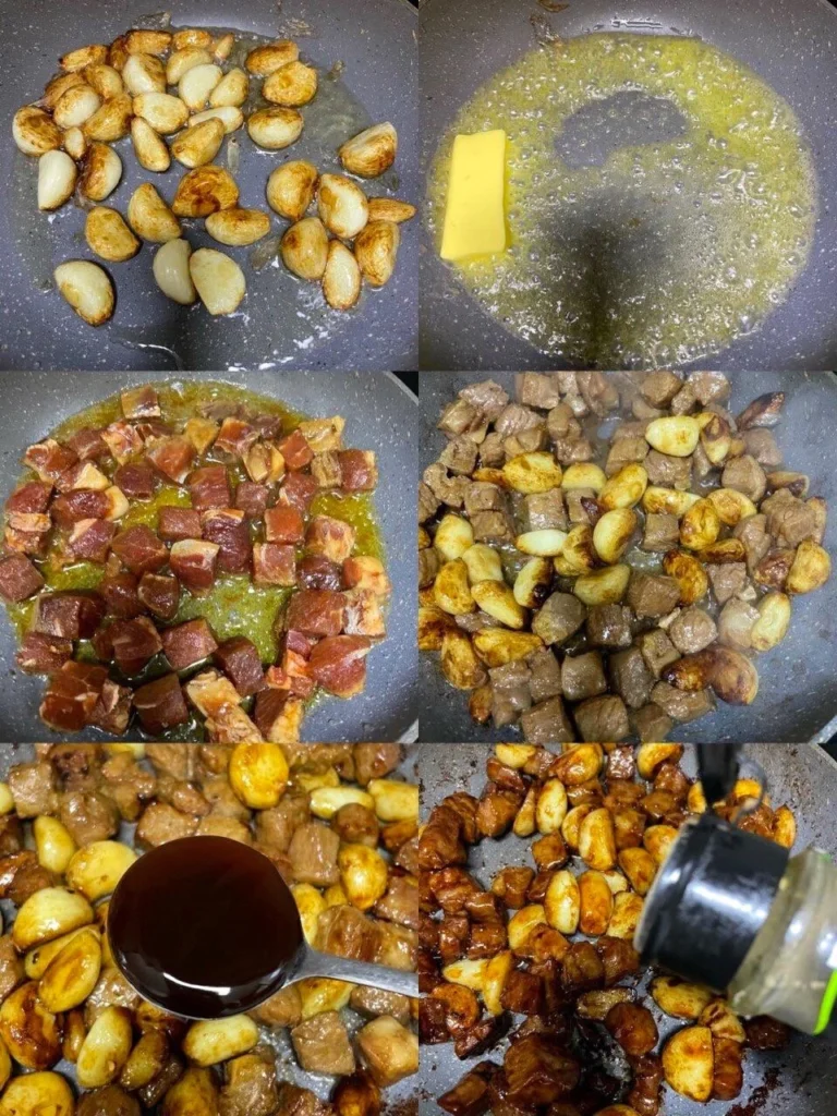 Add butter to the pan and melt. Return garlic and beef, add 1 tbsp oyster sauce and black pepper. Stir-fry briefly and serve.
