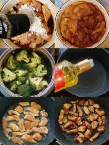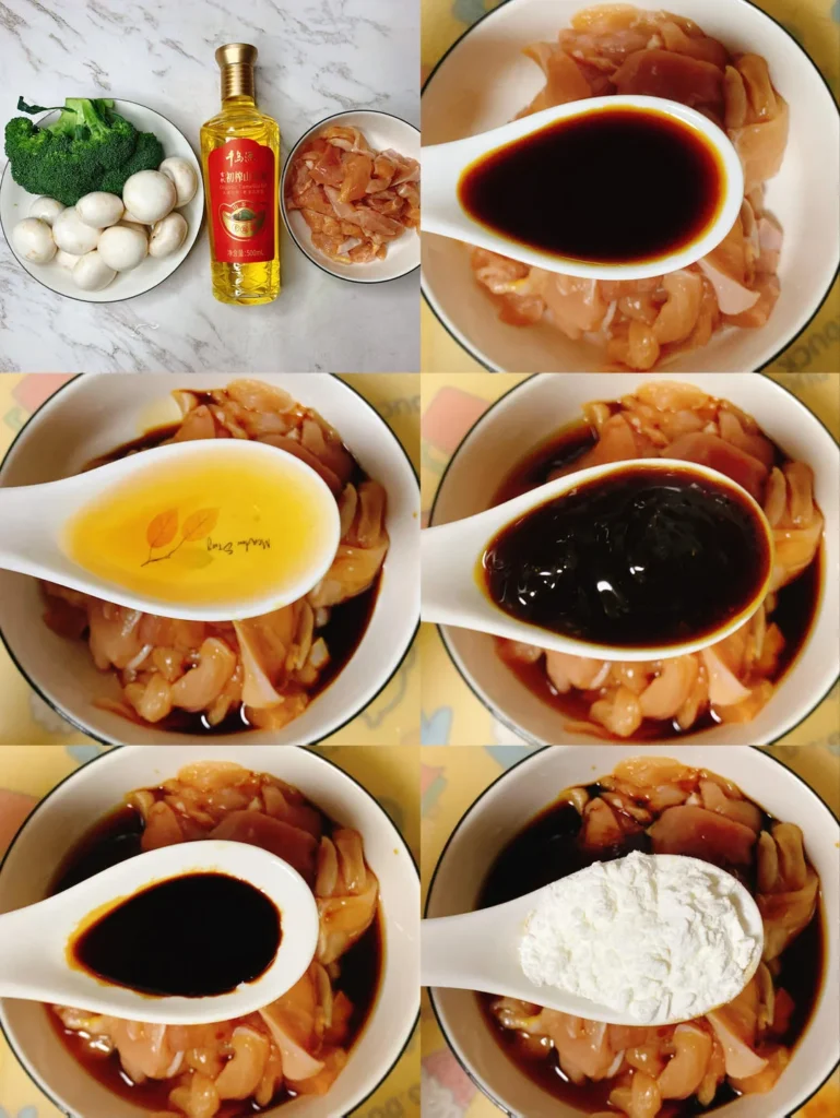 Cut chicken breast into thin slices. Add 1 tbsp light soy sauce, 1 tbsp cooking wine, 1 tbsp oyster sauce, 0.5 tbsp dark soy sauce, 1 tbsp cornstarch. Mix well.