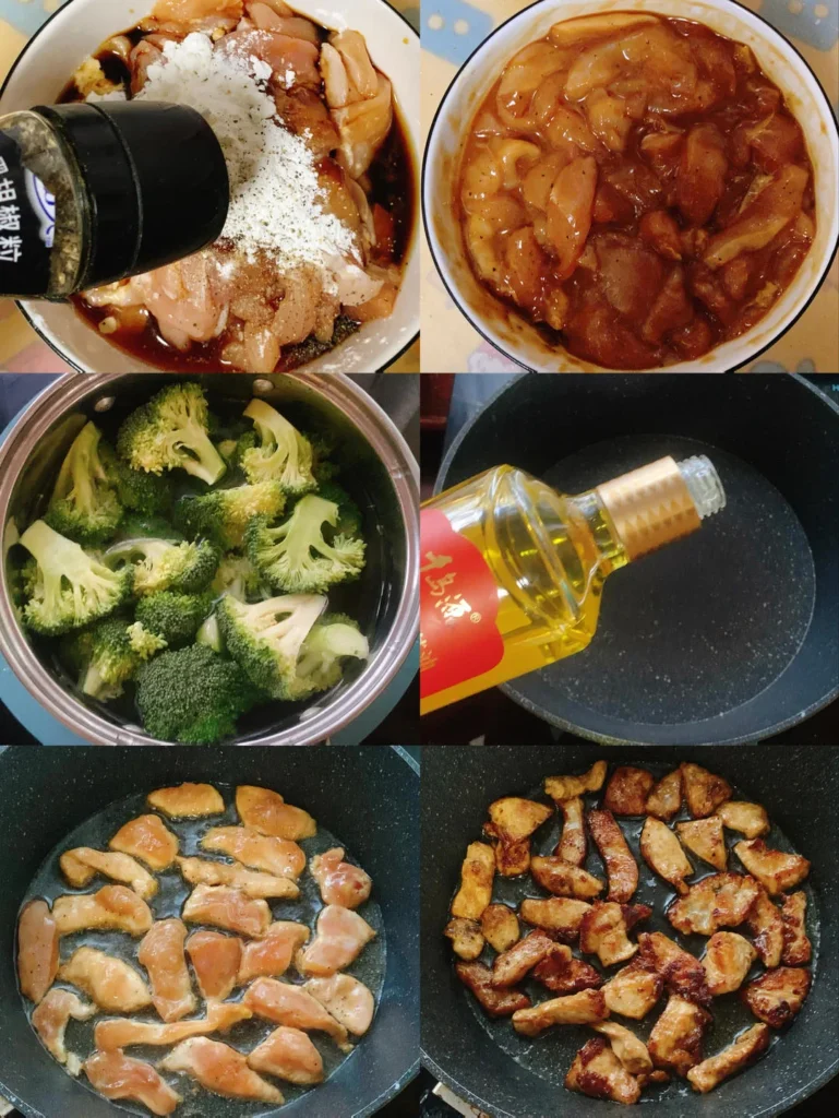 Add some black pepper and marinate for 30 minutes. Boil water in a pot, add some oil and a small spoonful of salt. Add broccoli and blanch for 2 minutes. Set aside. Heat pan and add some tea seed oil.