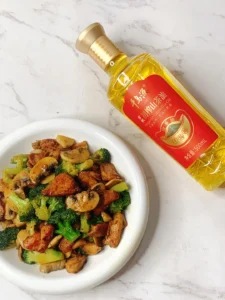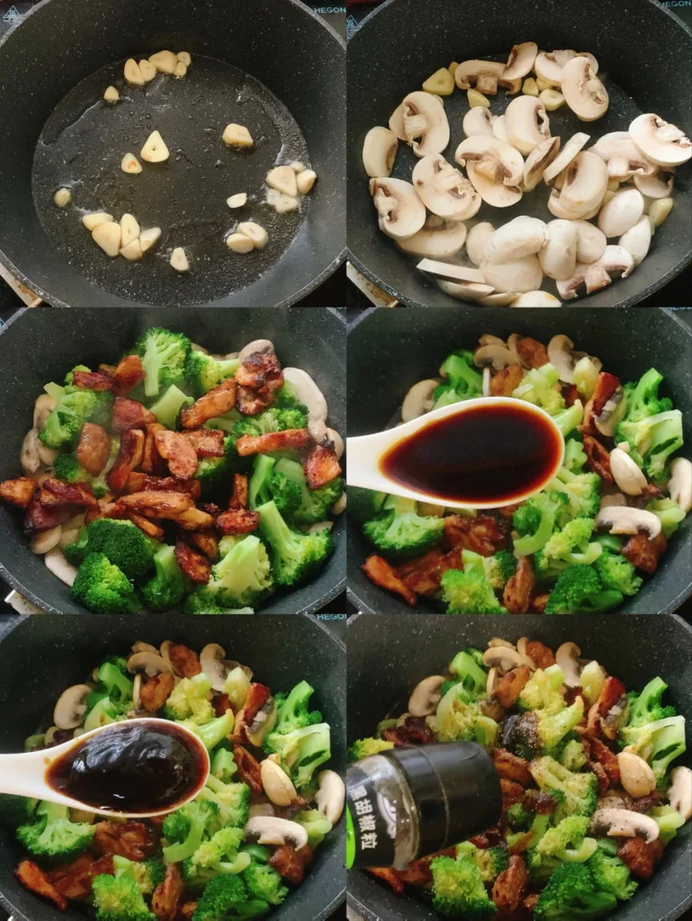 Leave some base oil in the pan. Add garlic slices and sauté until fragrant. Add mushrooms and stir-fry until soft. Add broccoli and chicken breast. Add 1 tbsp light soy sauce, 1 tbsp oyster sauce, and some black pepper. Stir-fry evenly and serve!