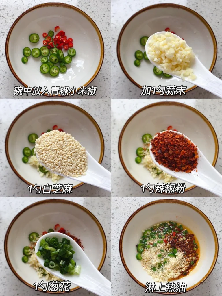 Make sauce: chilies, garlic, chili powder, sesame, scallions. Pour hot oil over.