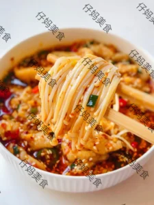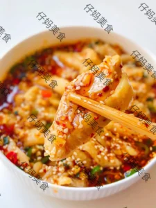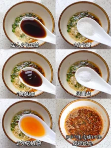 Add soy sauce, sugar, oyster sauce, salt, Sichuan pepper oil, chicken broth. Mix.