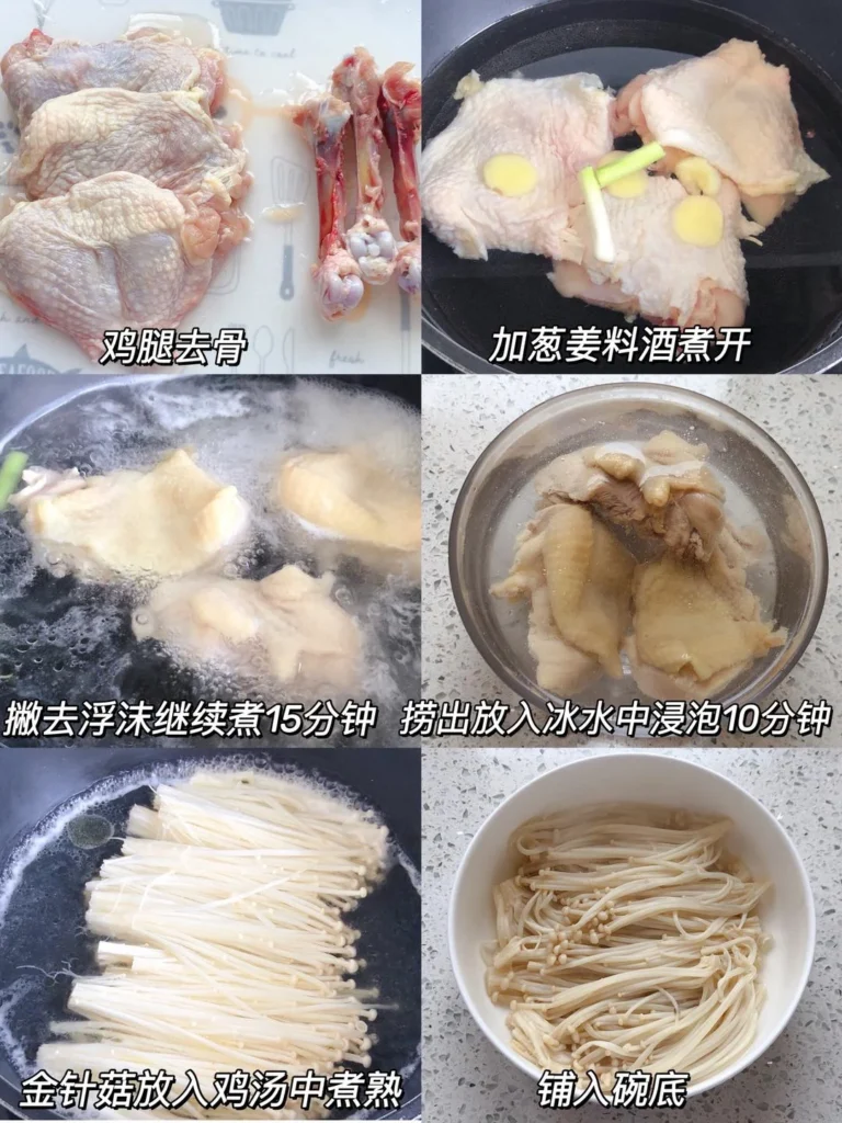 Boil chicken 15 min, ice bath 10 min. Cook mushrooms. Place in bowl.