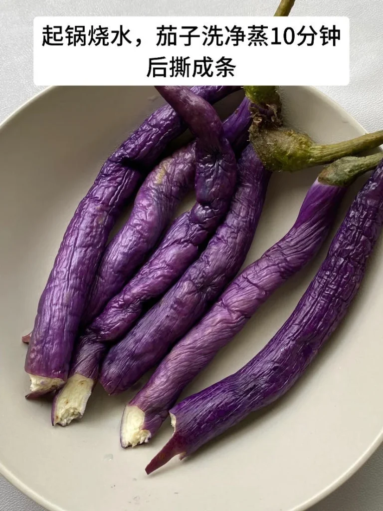 起锅烧水,茄子洗净蒸10分钟后撕成条,同时蒜末小米辣切好备用