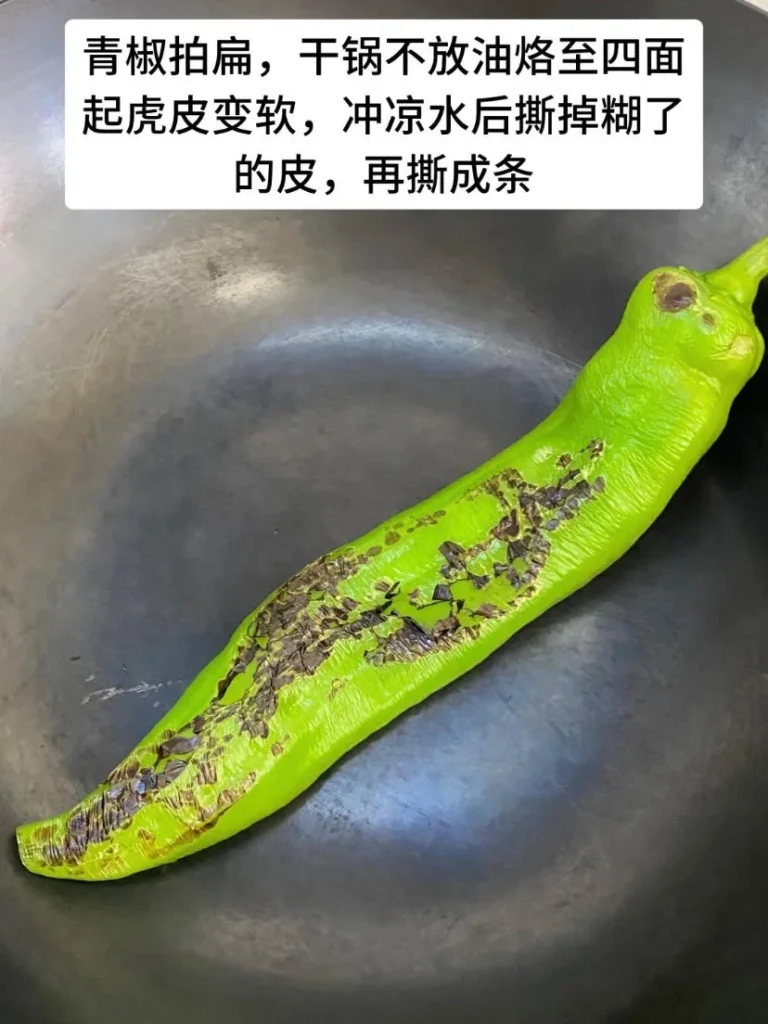 青椒拍扁,干锅不放油烙至四面起虎皮变软,冲凉水后撕掉糊了的皮,再撕成条