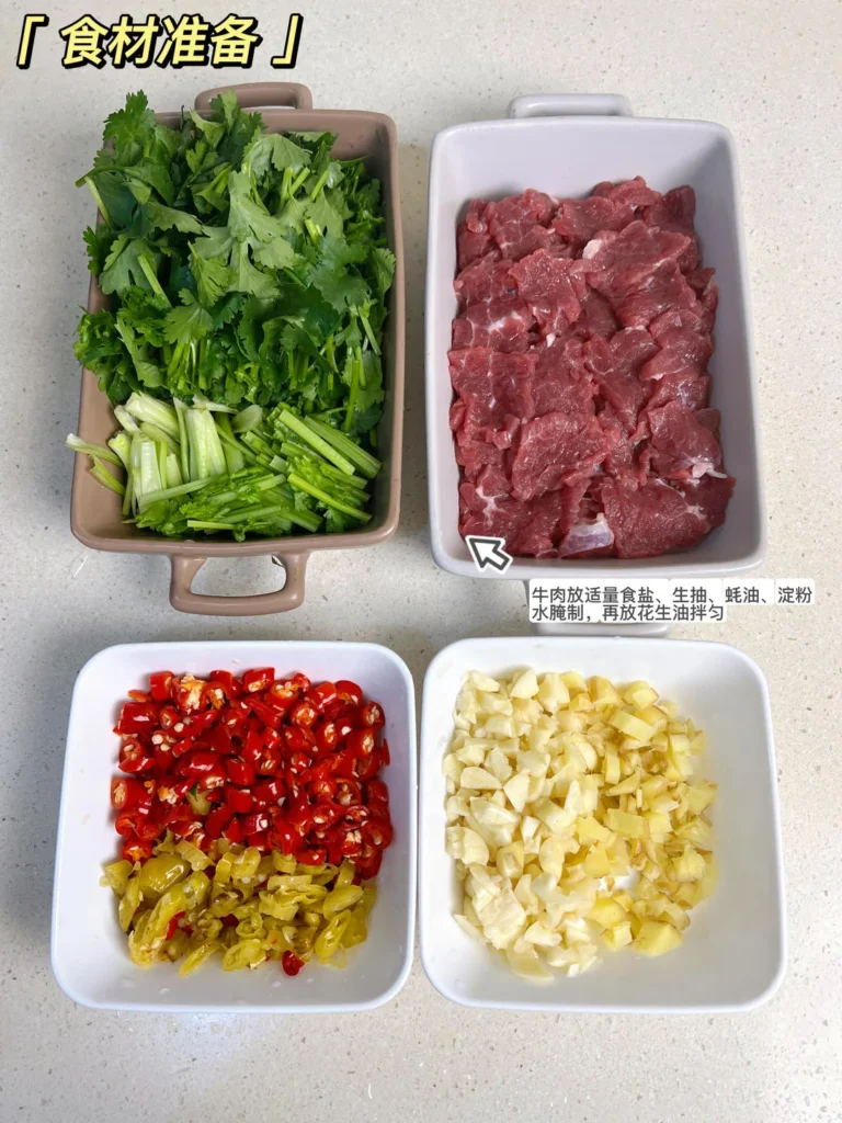 Slice beef thinly against grain. Marinate 10 min with soy sauce, oyster sauce, starch.
